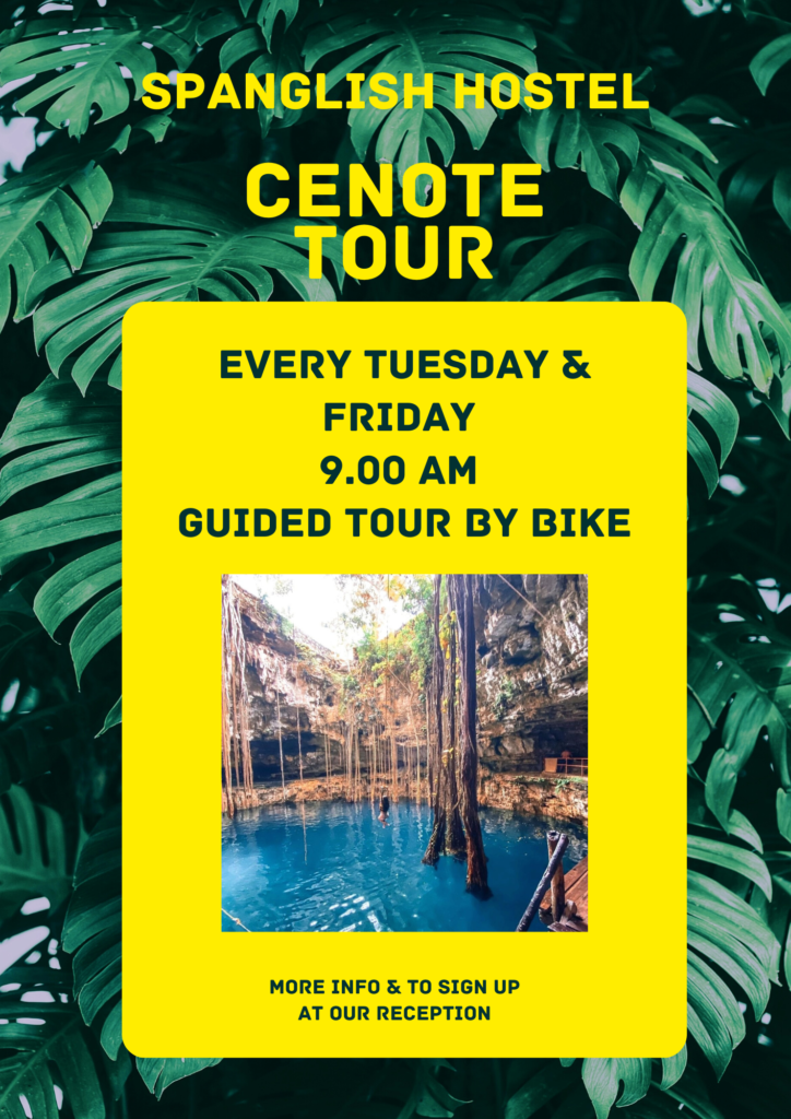 Every Tuesday & Friday we offer a guided cenote tour by bike, starting 9 am and with an approximate duration of 4.5 hours. Routes vary per day, bike rental is included in the price. For more information and to sign up; send us a message or come visit us at our reception!